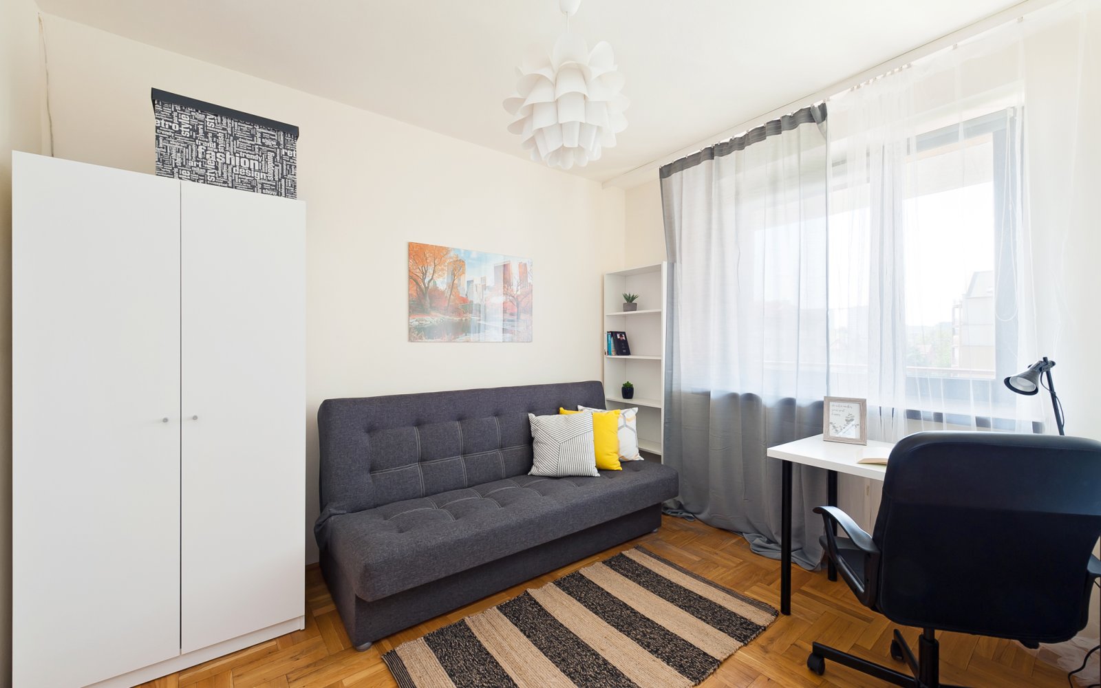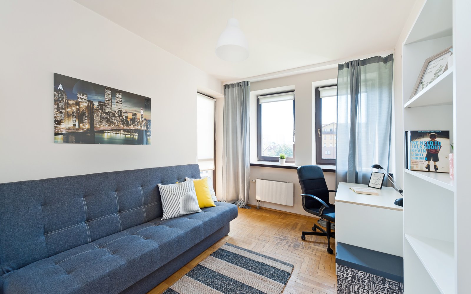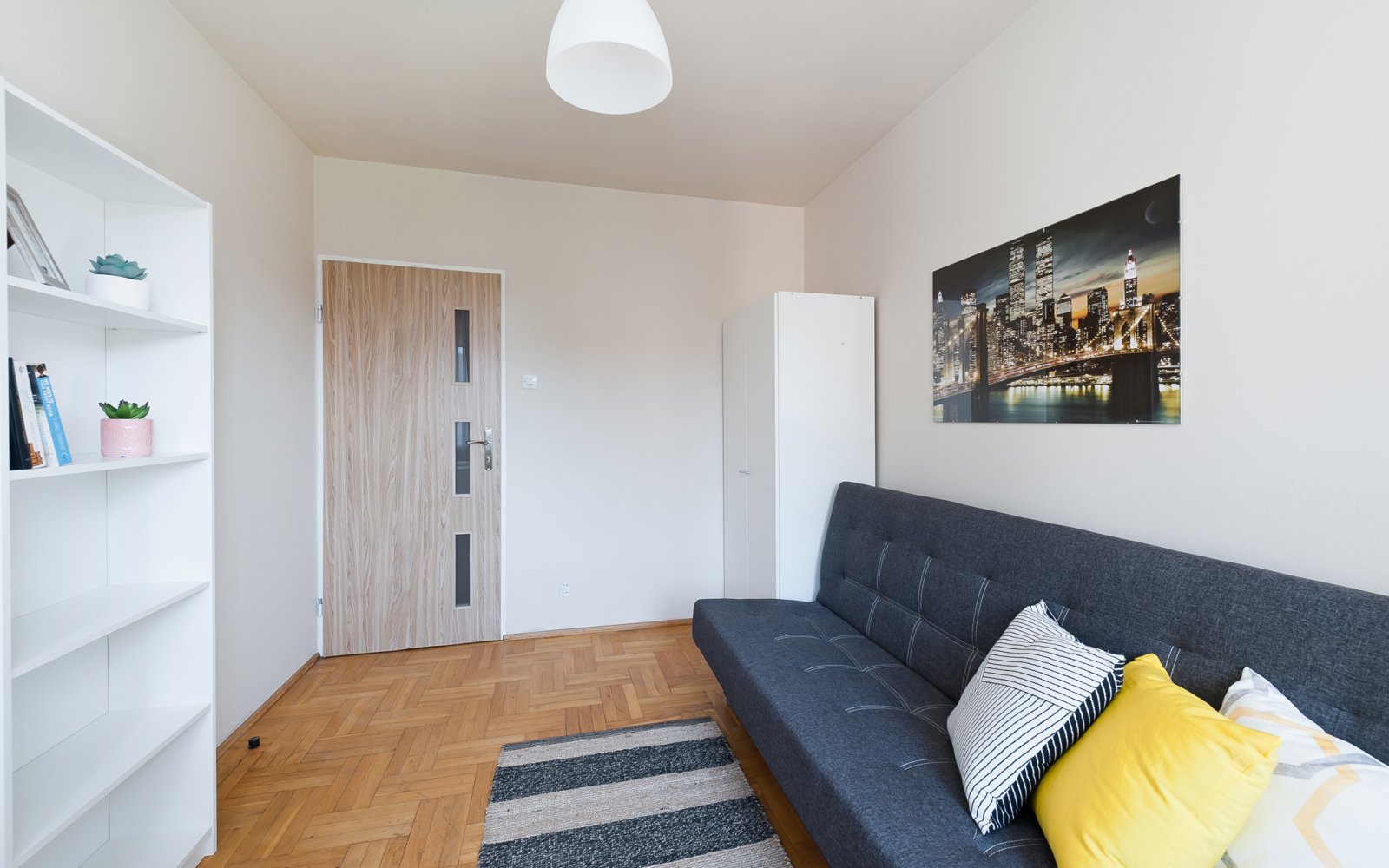 Mieszkanie o powierzchni 79 m2, składa się z 6 pokoi (z uwagi na wynajem dla studentów pokój dzienny przedzielony został na 2 mniejsze pokoje), aneks kuchenny, łazienka, oddzielnie toaleta i przedpokój. Mieszkanie posiada 2 balkony. Usytuowane na 3 piętrze w 4-piętrowym bloku. Właściciel może przywrócić mieszkanie do stanu pierwotnego czyli 4 pokoje i oddzielna kuchnia.