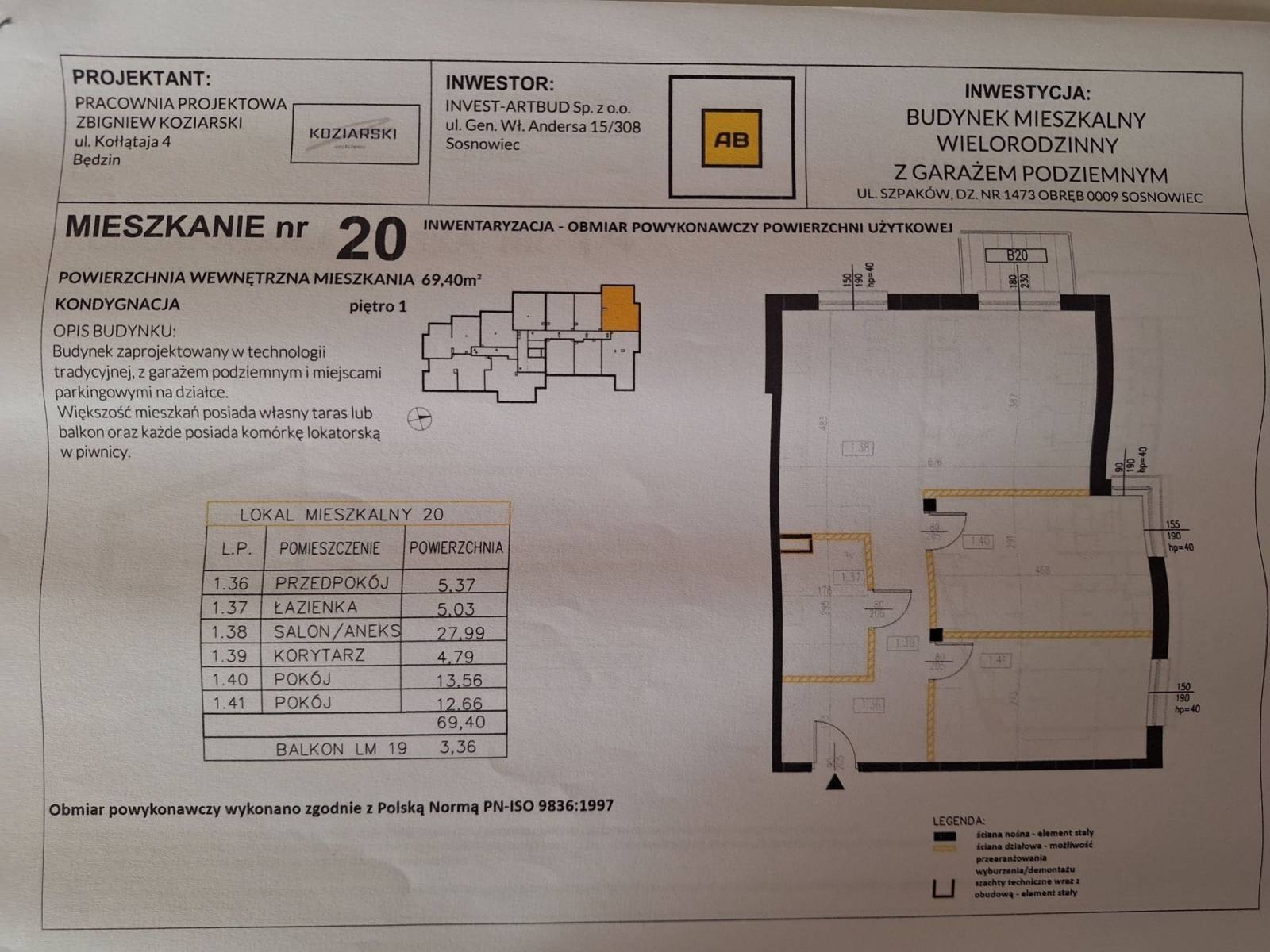 - powierzchnia mieszkania 69,40 m2